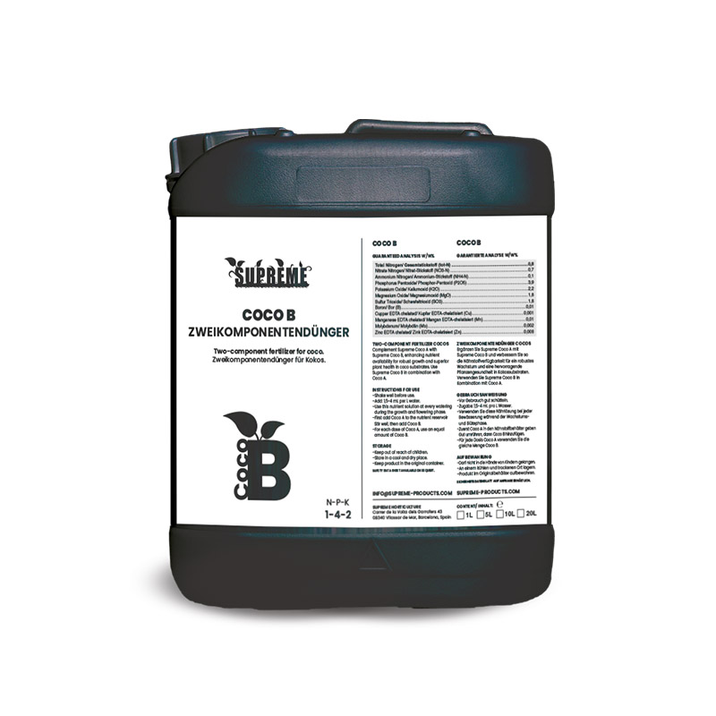 Complement Supreme Coco A with Supreme Coco B, enhancing nutrient availability for robust growth and superior plant health in coco substrates. Use Supreme Coco B in combination with Coco A.